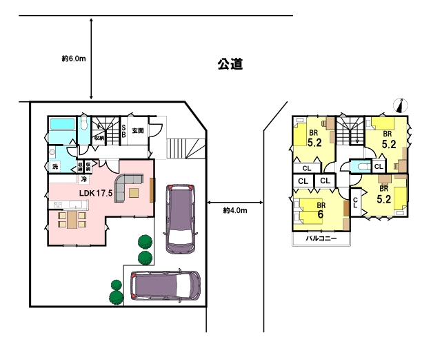 | 私道負担/道路 | 北側(公道)約6.0m、東側(公道)約4.0m |